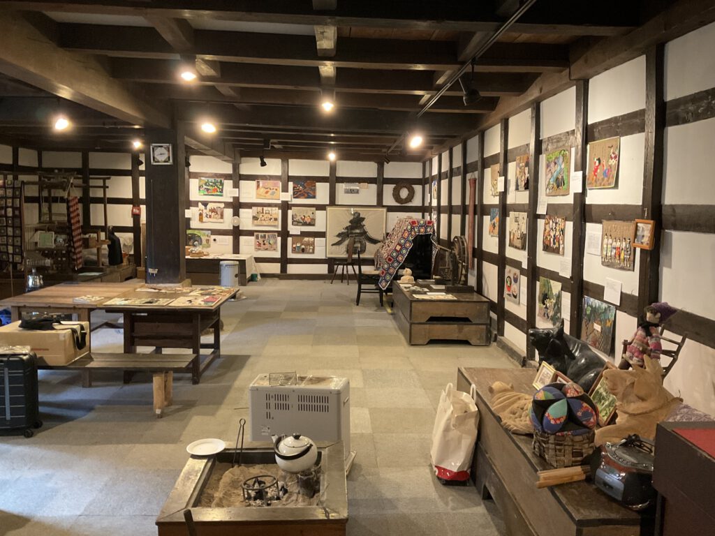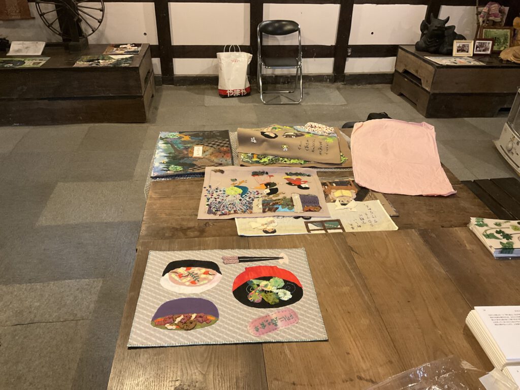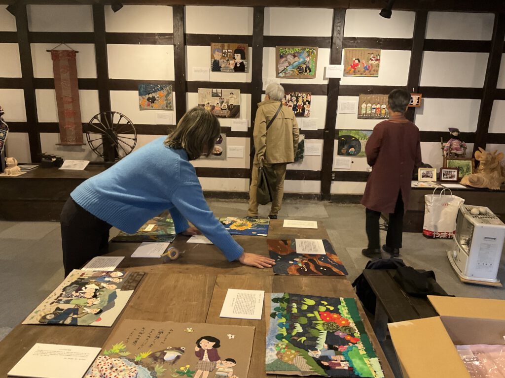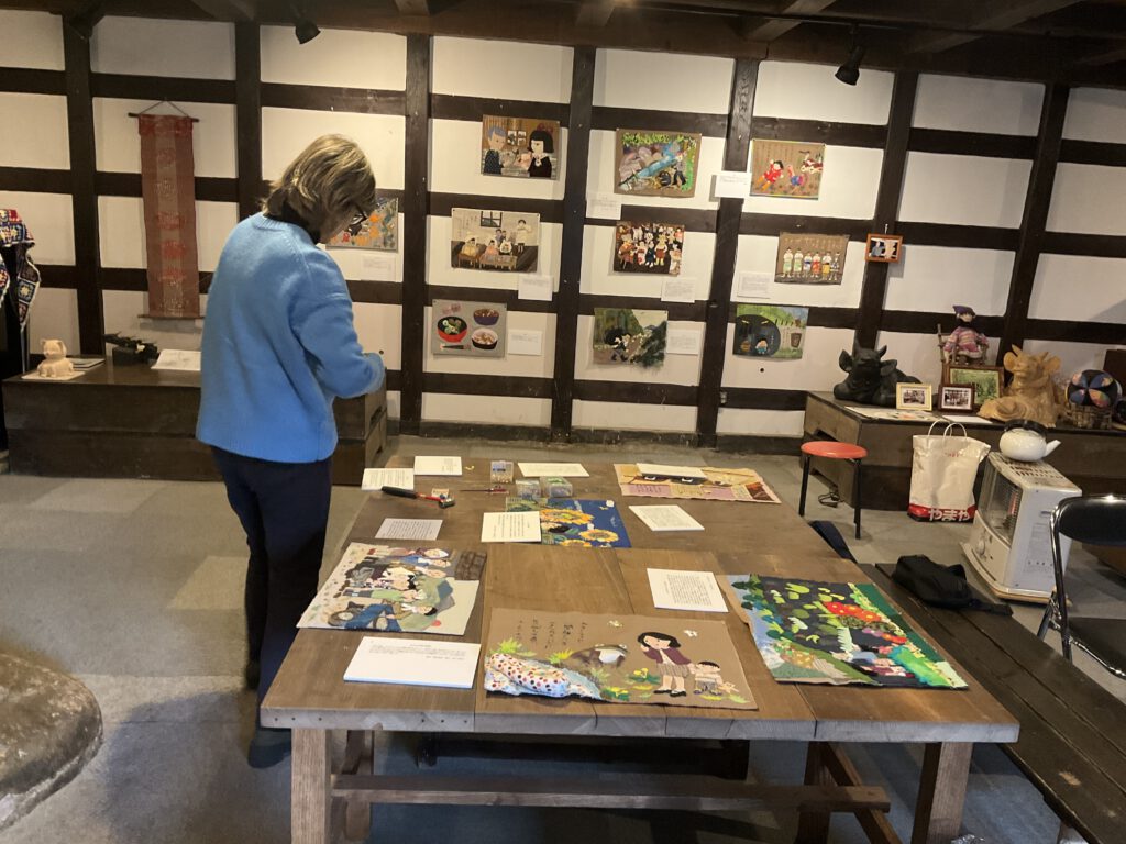 Even when a neighbor came by to see what was happening, Koike-san continued working without pausing, chatting as he worked, and managed to complete the installation within the allotted time. After finishing the display, we were treated to delicious anko-filled rice cakes and tea, warmed by an oil stove, but without time to relax, we hurried on to the next exhibition location, “Cafe Yadorigi.”
