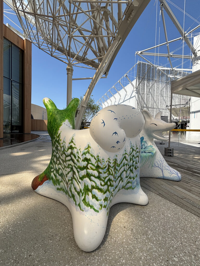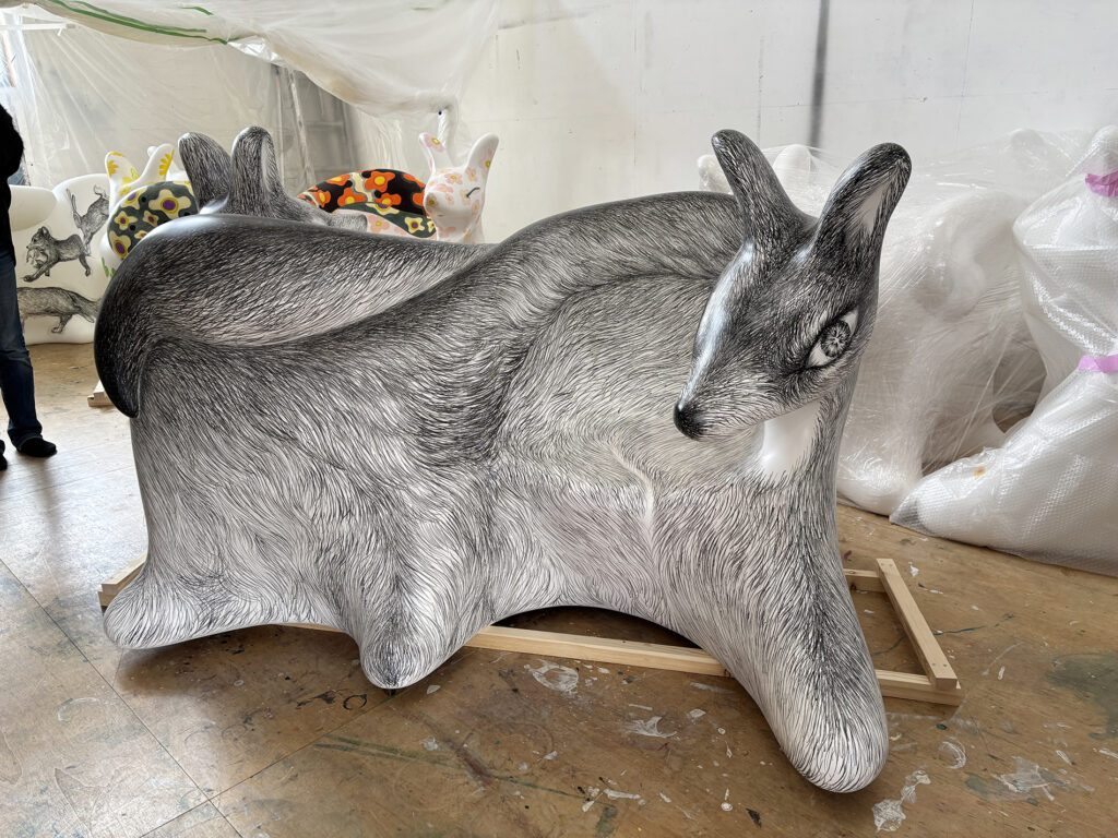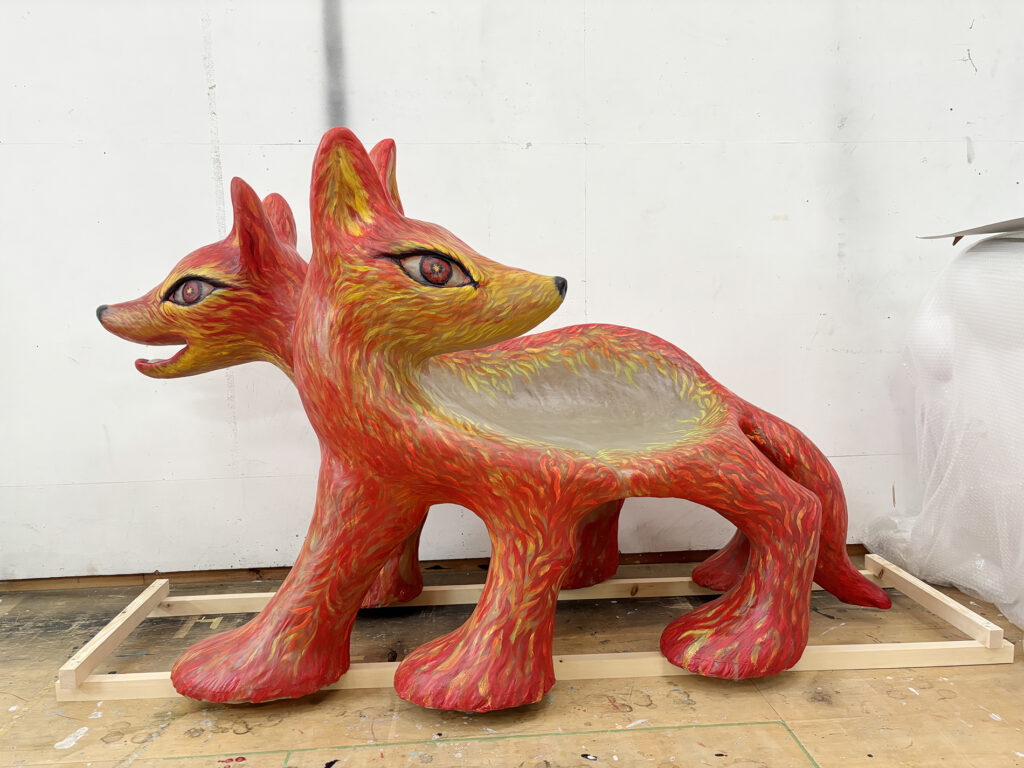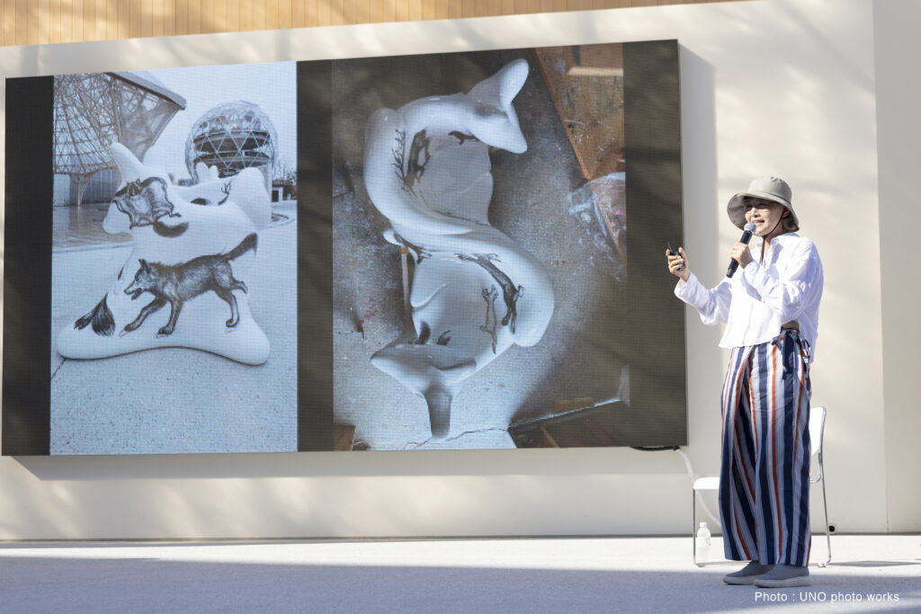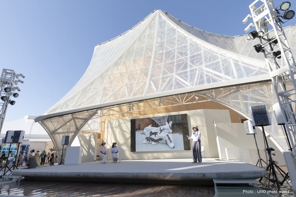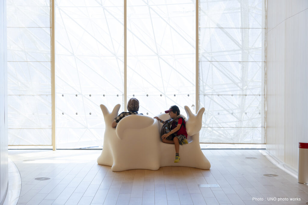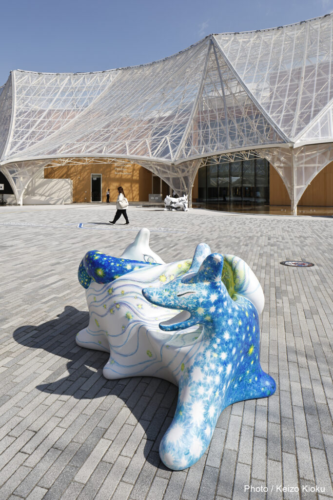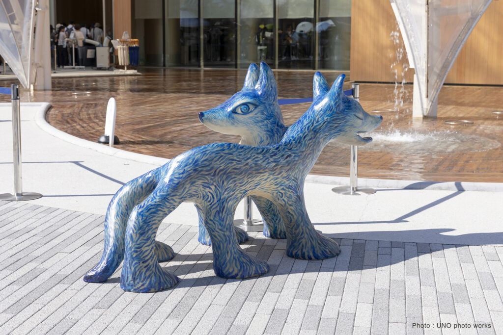 10個のオオカミベンチ(Wolf Bench)は、アーティスト鴻池朋子によって万博のために制作された座る作品で、万博終了後には作品は世界各地へ、無償で貸し出しをされていきます。「サクヤオオカミ プロジェクト」は、美術館に作品を観に行くのではなく、アートを必要とする場所へ、作品がこちらから出掛けてゆき、その場に喜びや元気を生みだしていきます。そしてまた、オオカミベンチと共に過ごした人々は、次のアートを必要としている誰かのために作品をバトンとして送りだす、という、アートが持つ本来的なエネルギー循環を目指していくプロジェクトです。オオカミがあなたを優しく包み込みます。ぜひ実際に座って、撫でてご堪能ください。