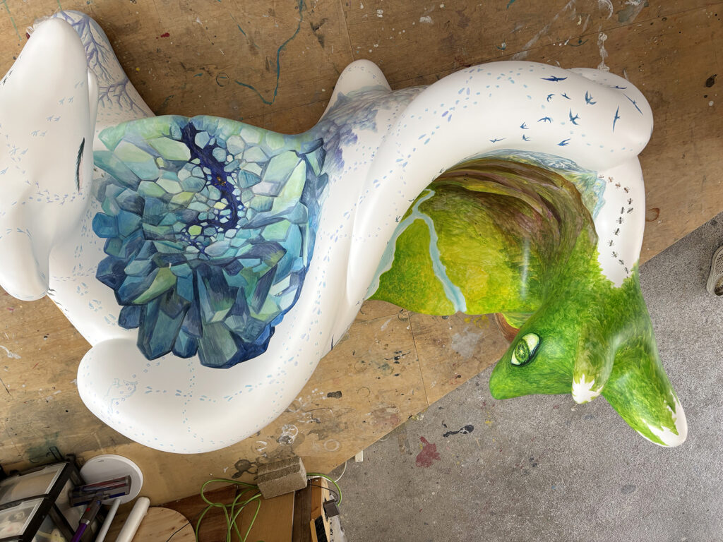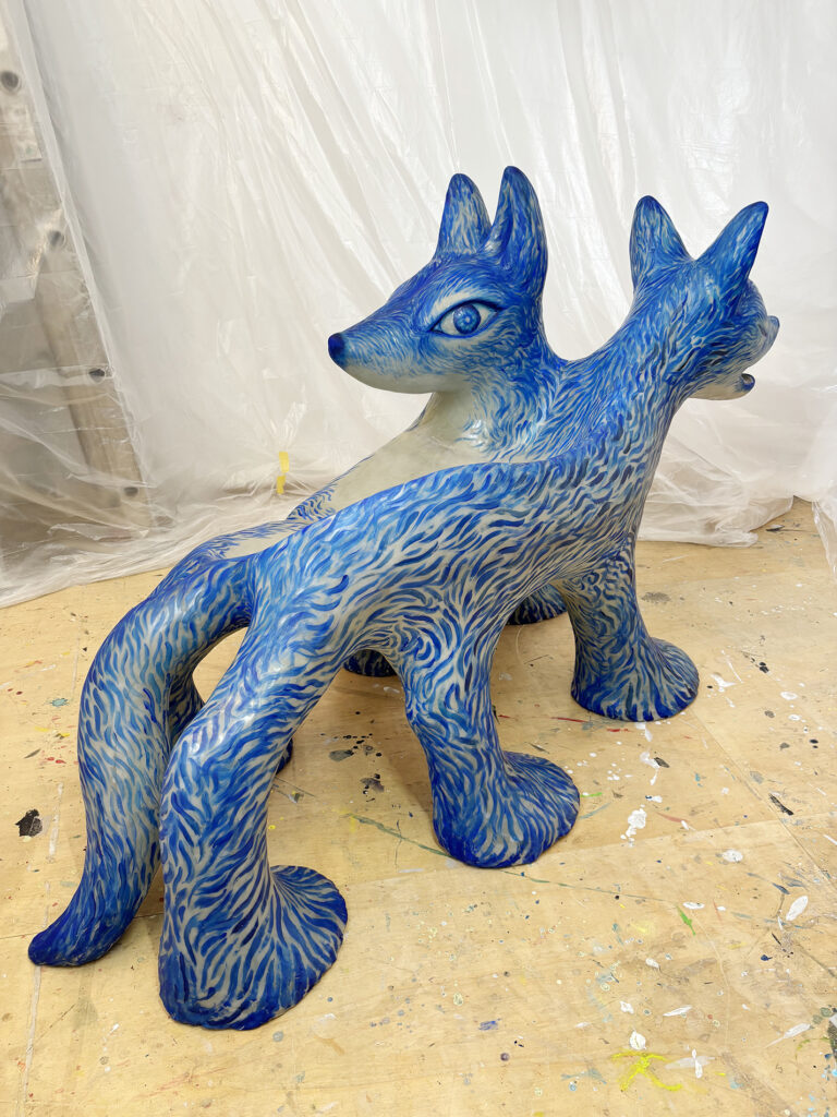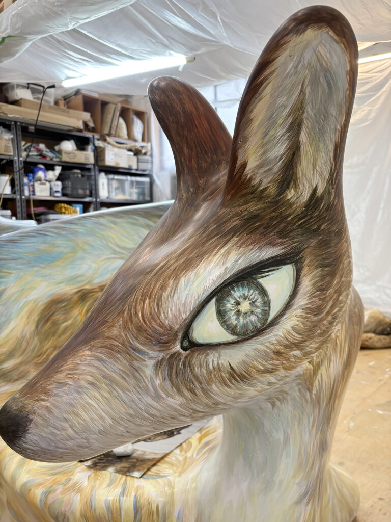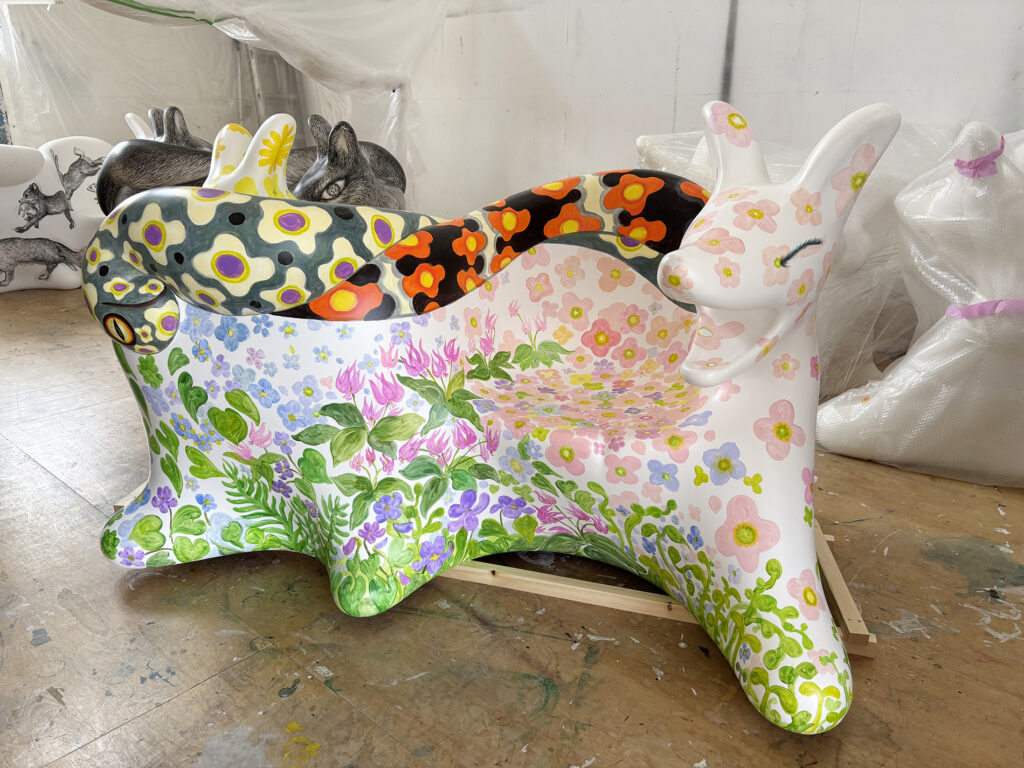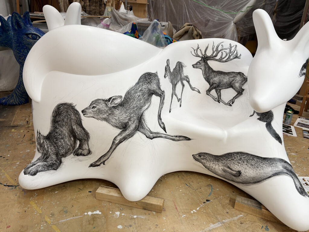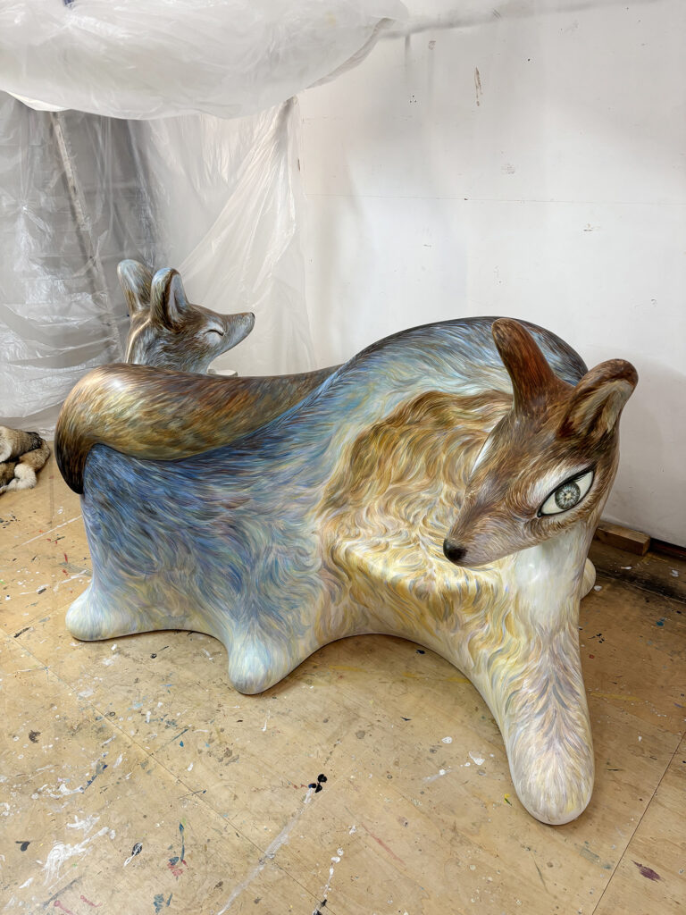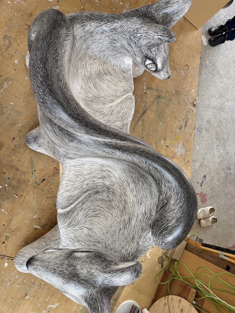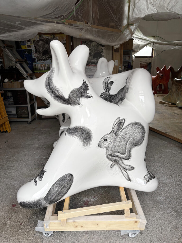 10個のオオカミベンチ(Wolf Bench)は、アーティスト鴻池朋子によって万博のために制作された座る作品で、万博終了後には作品は世界各地へ、無償で貸し出しをされていきます。「サクヤオオカミ プロジェクト」は、美術館に作品を観に行くのではなく、アートを必要とする場所へ、作品がこちらから出掛けてゆき、その場に喜びや元気を生みだしていきます。そしてまた、オオカミベンチと共に過ごした人々は、次のアートを必要としている誰かのために作品をバトンとして送りだす、という、アートが持つ本来的なエネルギー循環を目指していくプロジェクトです。オオカミがあなたを優しく包み込みます。ぜひ実際に座って、撫でてご堪能ください。