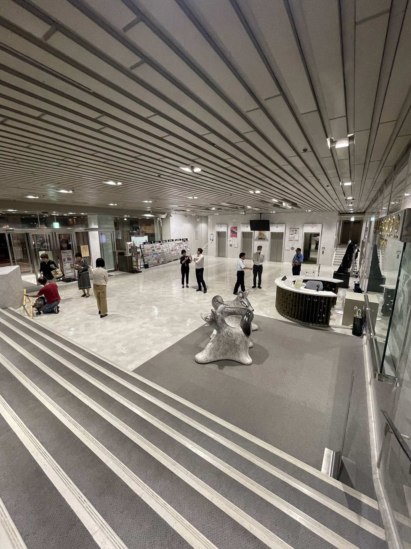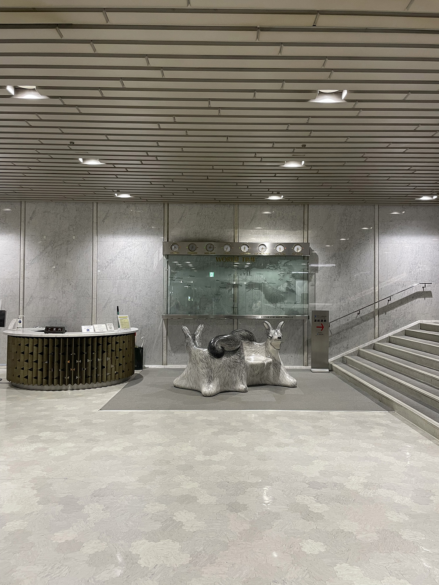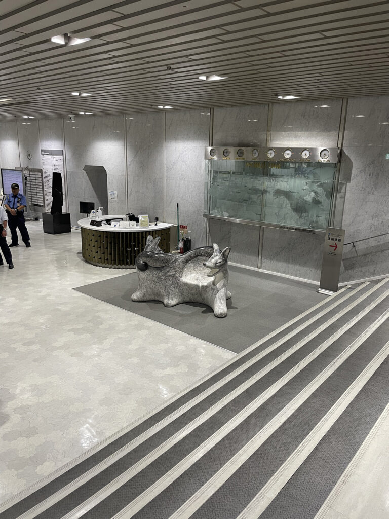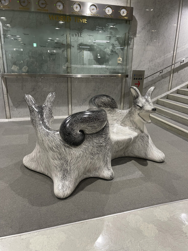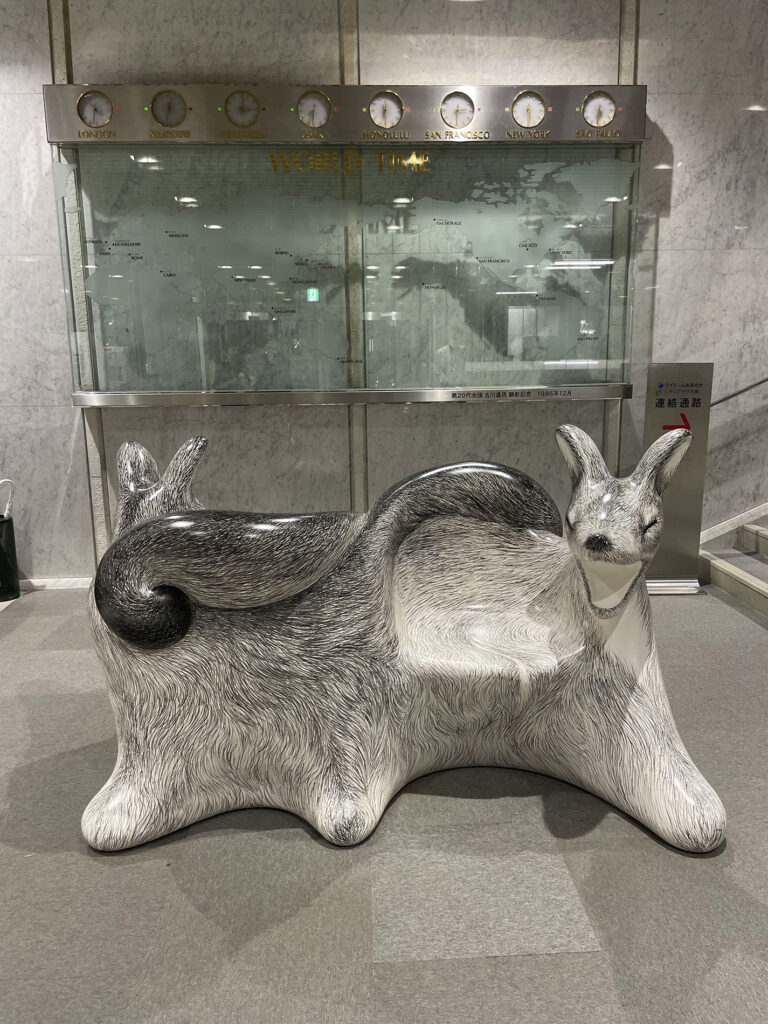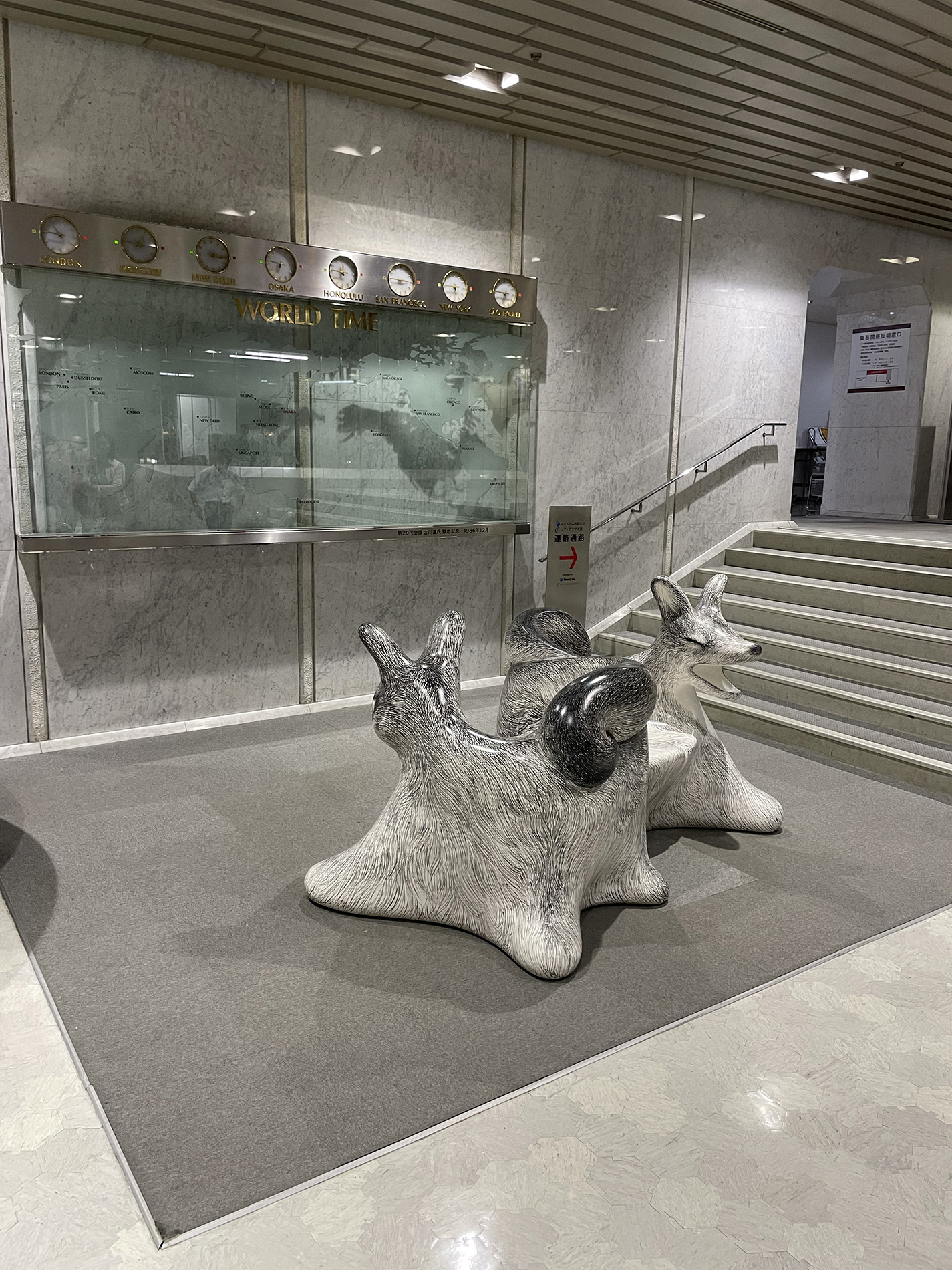 大阪・関西万博の鴻池朋子のオオカミベンチたちが、いよいよメディシン・インフラ プロジェクトとして全国へ旅立ちます。Wolf Bench/ Black & White Fur:2025年10月17日、大阪商工会議所、1階ロビーに設置されました。