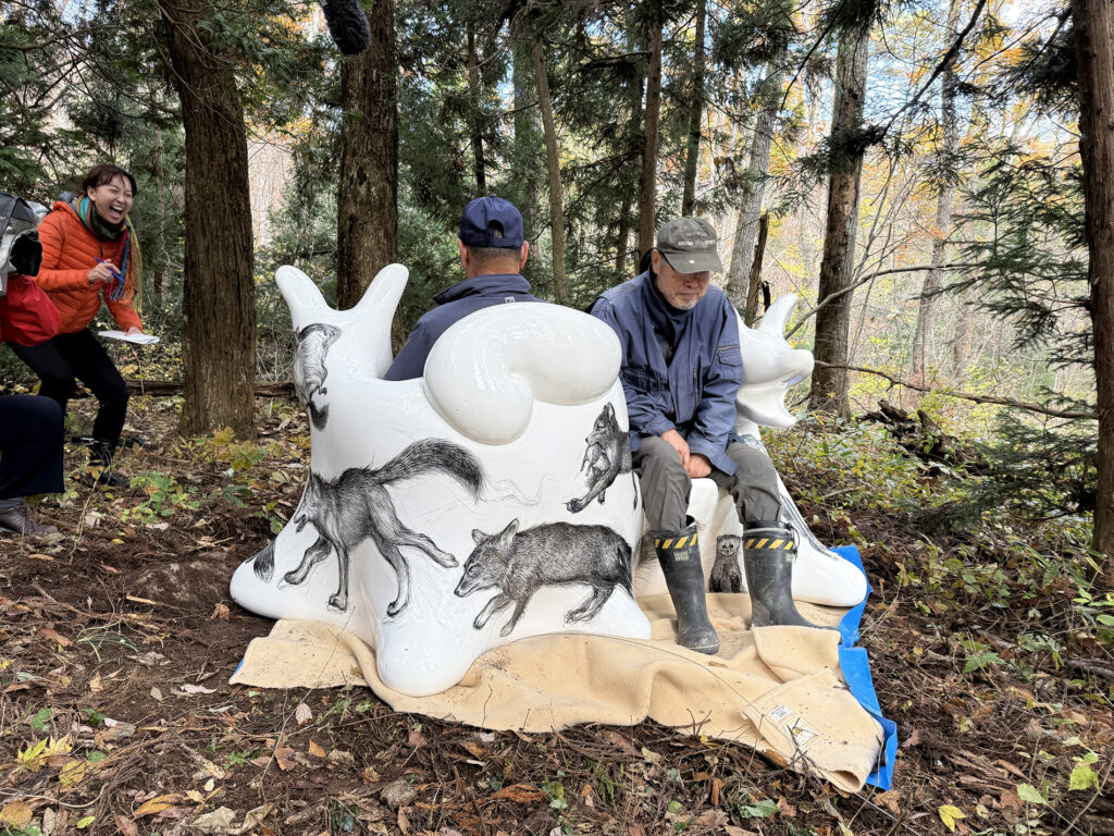 今回の万博で作品の貸し出しプロジェクトが固まってきた時に、オオカミベンチの作品の一つは、ぜひ福島の飯舘村に置きたい、と、これは迷いなく思いました。なぜなら、飯舘村はある種の地球の“へそ”のように思ったからです。そういう場所は繊細で、時間が経つと、また私たち人間によって掻き消されていってしまう恐れがあります。忘れないように、目印としてでもベンチをおく必要があるように思いました。