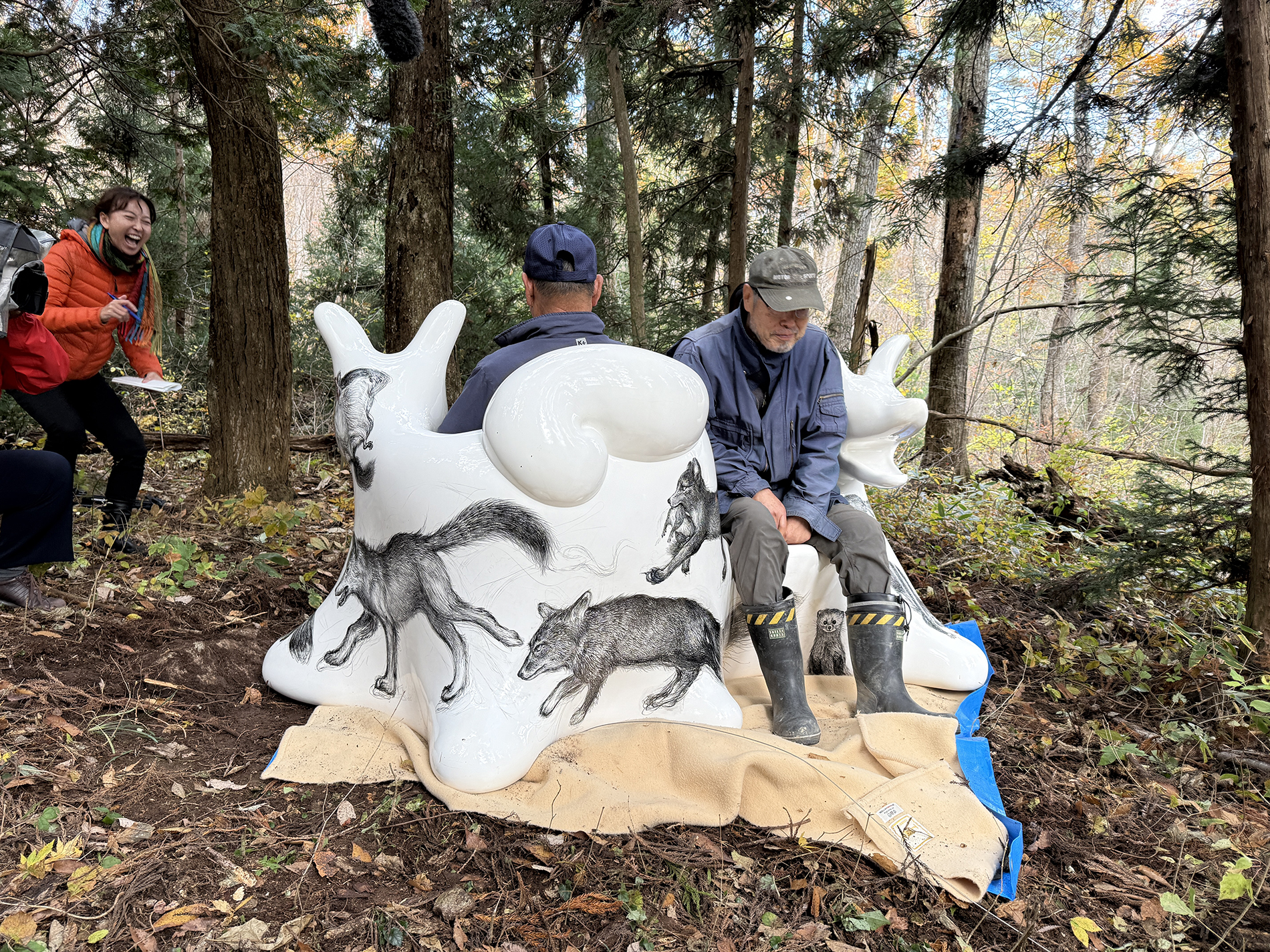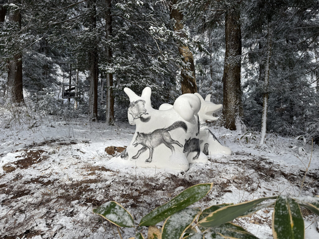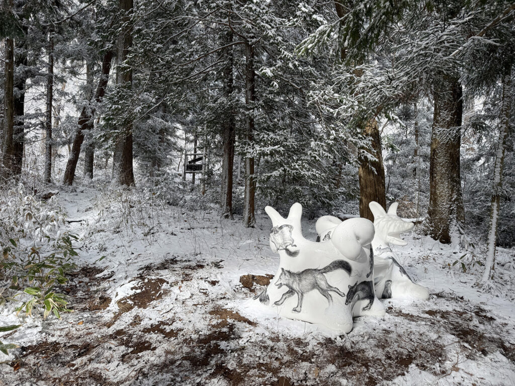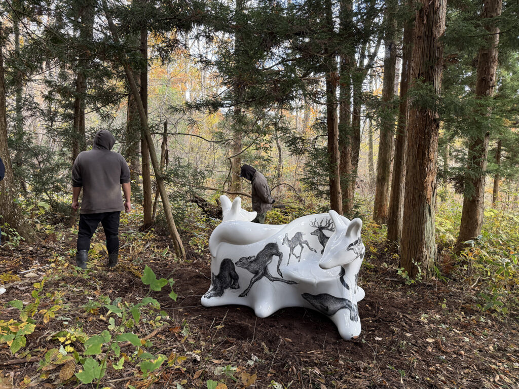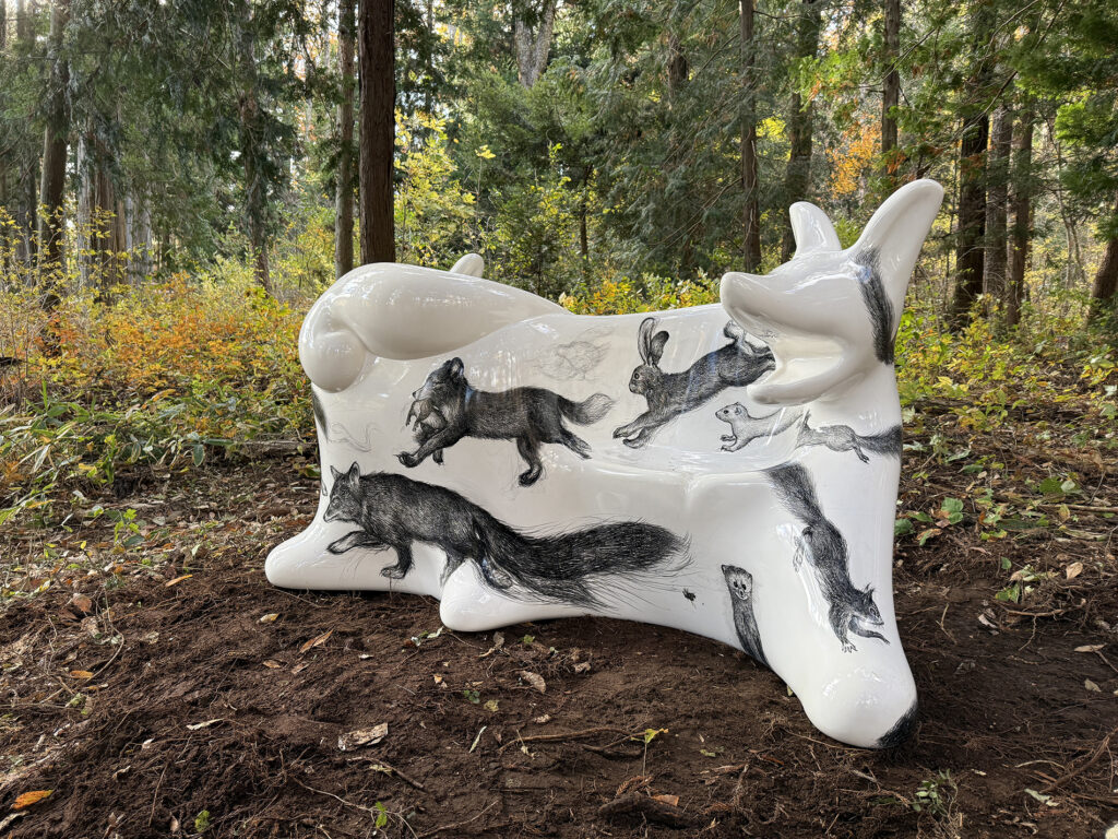 この作品は、今年開催された大阪・関西万博2025 の大阪ヘルスケアパビリオン前に設置されたオオカミベンチ10 体の内の一つです。それらの作品は全て違う絵柄が描かれ、万博の終了後には私と縁のあった場所や人々へ無償で貸し出しされてゆく、というプロジェクトのもとに制作されました。こちらのオオカミベンチはS 字型の二人掛けで、二匹の狼がそれぞれ別々の方向を向き、尻尾で絡み合って一つのベンチとなっています。ボディには狐、兎、テン、アザラシ、狼などの動物たちが直にドローイングされ、それらのモチーフは私のアトリエにある古い毛皮のコートや剥製動物からヒントをもらい描きました。他の9 体のオオカミベンチも、現在、全国各地へと貸し出しされていっております。