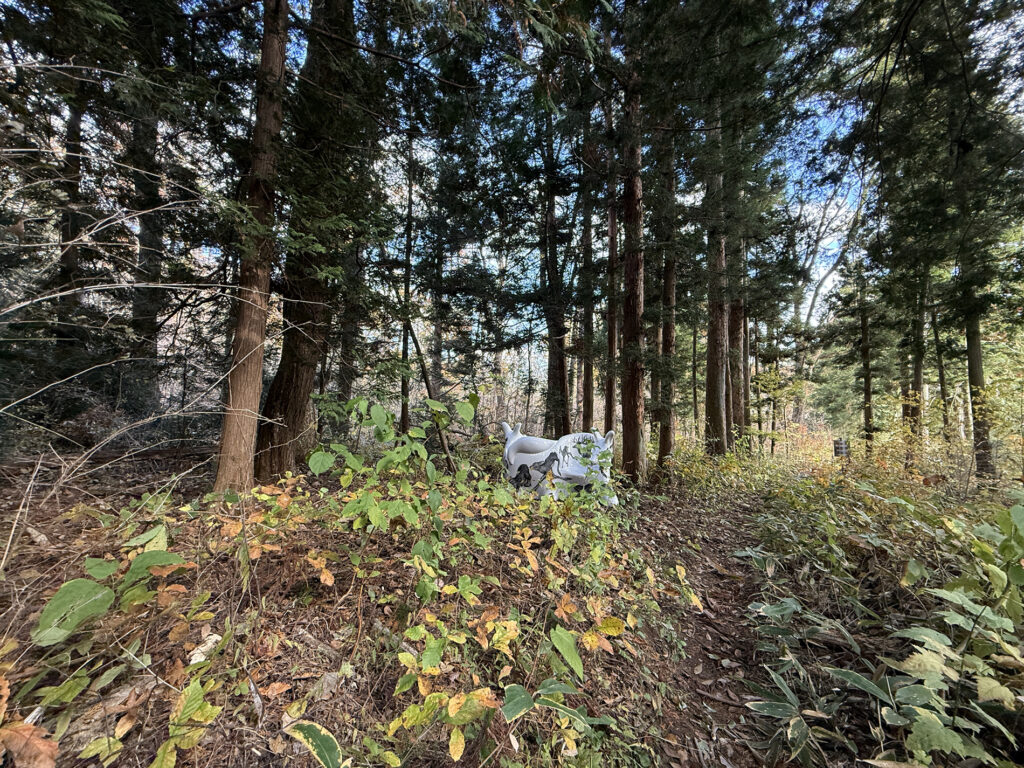 ここ山津見神社の神様は、もちろんこの山の上の本宮にいらっしゃる事になっています。けれども、もしも自然界の状況を、神様がとても憂えて心配されているのならば、神様は家に安堵してなどおらず、すぐに一番危うい場所に出向いて、しっかりとそこで私たち人間の行動を見て守っておられるのではないか、と思ったのです。14 年前に起きた大地震による自然災害と、その直後の放射能汚染という人災は、やはり日本の自然とこれまでの考え方が大きな岐路に立たされた日でした。よく経済的ダメージと言いますが、経済の始まりとなる交換とは、農耕による生産から始まり、その農耕の根幹を支える太陽や雨の恵みとは、自然界からの純粋贈与です。掛け値なしの、交換条件もない、見返りなしの、私たち人間への全く純粋な自然からの贈り物があってこその経済なのです。ここ飯舘の神様は、その大切なことを、また人間によって忘れ去られてしまわないよう、しっかりと守るべき場所、気づかせる場所に出向いていると思うのです。そう仮定してみると、オオカミベンチは、その神様の出張所と思われる場所に、目印や道標として設置するのが、ミッションとしても面白いのではないかと思いました。例えば、いま神様は除染が終わったばかりの地区の道の横の林で、見守っているような気もします。見えないものを無闇に恐れるのでも神格化するのでもなく、科学的に可視化し数値化するだけでも、また無いものとして排除し無視するのでもなく、ただそのまま感じる、ということを、弱い動物である人間は、全身全霊でしてきたように思います。