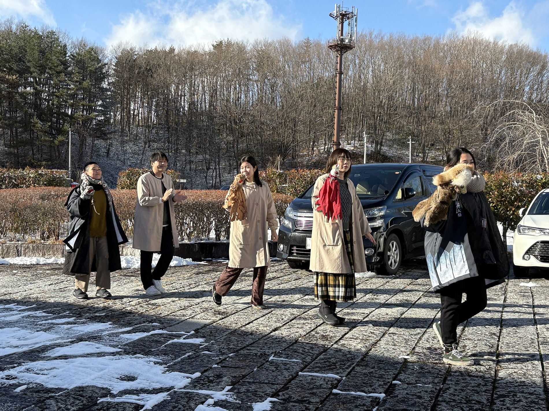 最近再開したという牧場から牛肉を直で買って、美味しいステーキもつくってくださいました。長い時間かかって、完全ではないけれども牧場や農場の土が少しずつ元に戻り、そこに草が生え、その草を牛が食べ、育ち、美味しい肉となって私の口に入る、その美味しさはひとしおです。栄養となって私の体の一部となり、健康で大満足です。が、これからはその先を考えます。人間だけの満足、人間中心の思考で終わらないために、また、私の体も地球の一部として機能するように、次へバトンタッチする何かを考えるようになります。自分の作品も人々によってリレーし、バトンタッチしていける構造を持ったものにしたいと思いました。この様に、あらゆる当たり前の大切さを、改めて意識化してくれる飯舘村は、私にとってまるで自然の学校のように見えてきました。今でこそ地球温暖化と、それによる人間のエコロジー不安という問題で世界の研究が盛んになりましたが、飯舘は 15 年前の震災という未曾有の自然災害と原発事故による人災を被り、人間が地球にしてきた無謀なコントロールの実態というものに直面し、いち早くそのトラブルシューティングに具体的に取り組み、実験、実践してこられたのだと思います。私が飯舘という場所が地球の“へそ”みたいだと感じるのは、自然豊かな場所であり大きな災害があった場所であると同時に、それによって場の時間軸が変わり普遍性を帯び、人間界と自然界の結界のように感じるからと思います。