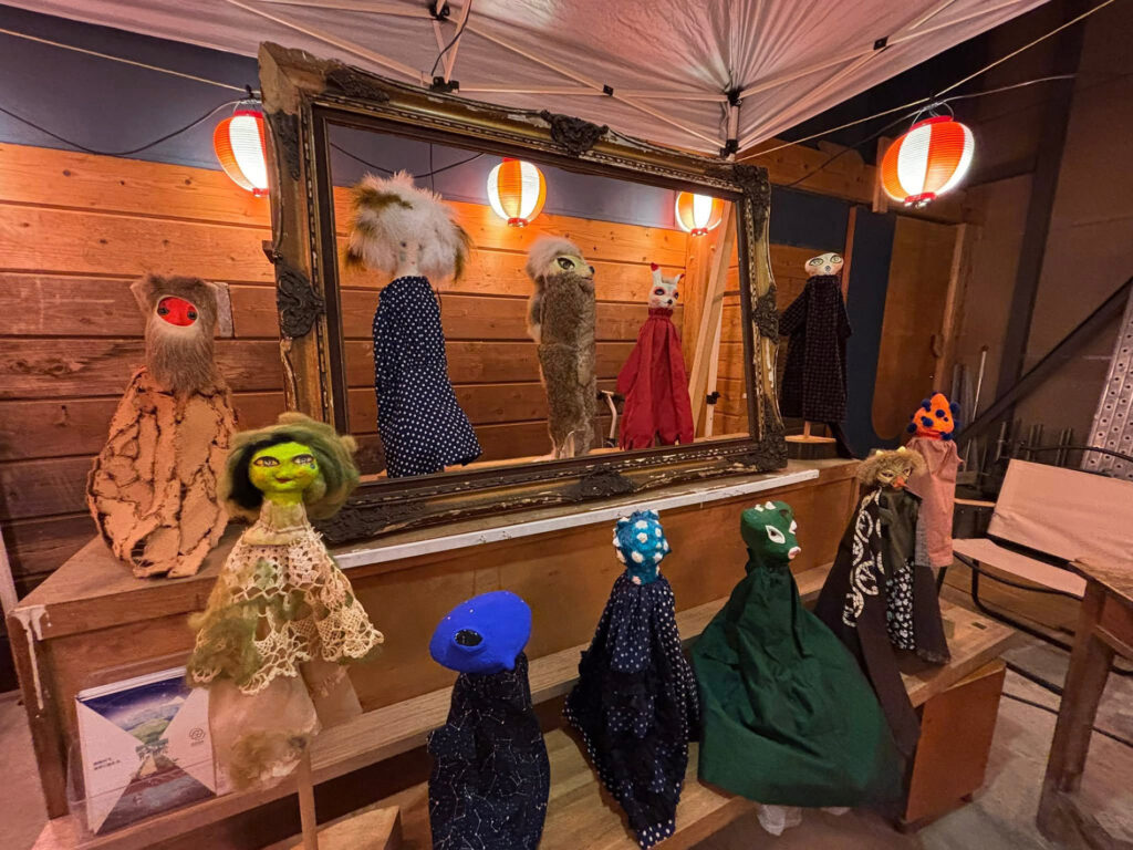 ここにある小さな指人形たちは、飯舘に棲むたくさんの「人間ではないものたち」です。何がきっかけでつくり始めたのか定かではありませんが、長い間この仕事をしていると、スタジオにはたくさんの素材の断片や材料の残りが積み重なって部屋の隅々に溢れています。壊れた工具、ガラス瓶、木材、布や糸、発泡スチロール、玩具、作品模型、動物の骨、草木の種、昆虫の死骸などなど、そういった何かの“残り物”たちを触って遊んでいると、なんとなく人形が出来上がってきます。自然にそう成ってしまった、のです。美術館などで展示する目的を持った作品ではなく、制作途中に出たゴミ、こぼれ落ちていった画材たちが集まってできたものです。そういうものたちは指人形の材料としてなぜかとてもフィットし、強度を持ちました。
