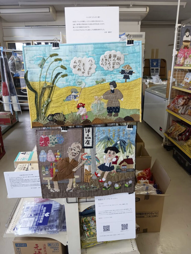 食料品、お酒、日用品、郵便局、水槽、釣り船まである素敵な商店。そんな商品の隙間をぬって「物語るテーブルランナー」を展示しています。